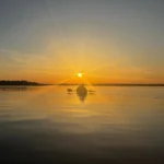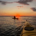 Pagaiare in acque tranquille mentre il sole tramonta